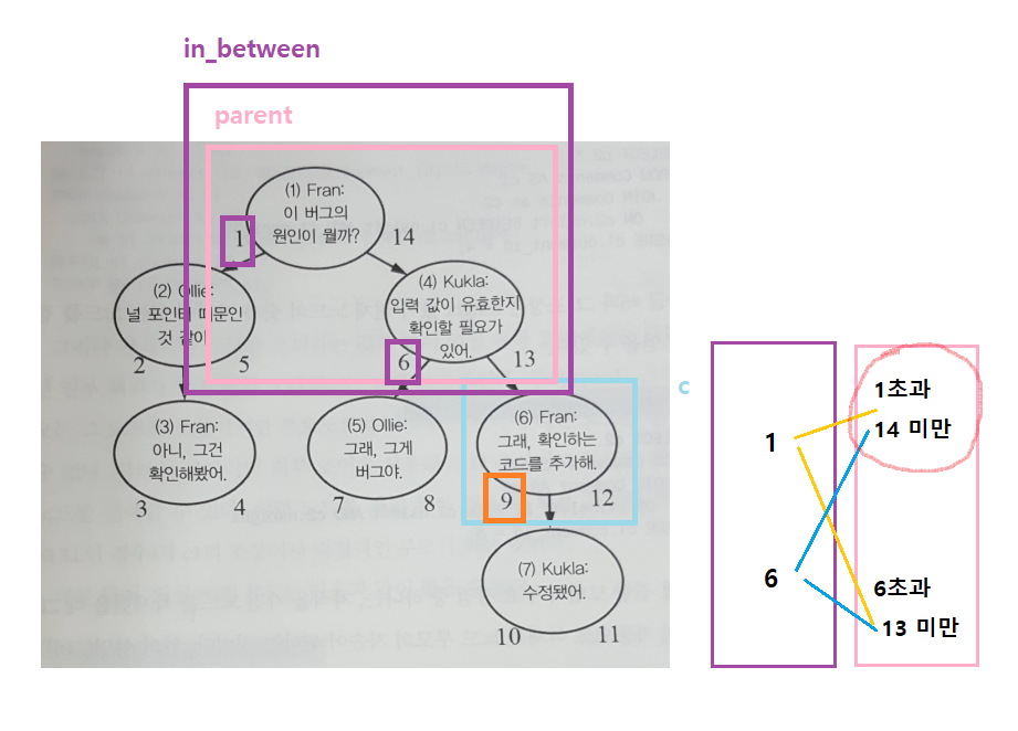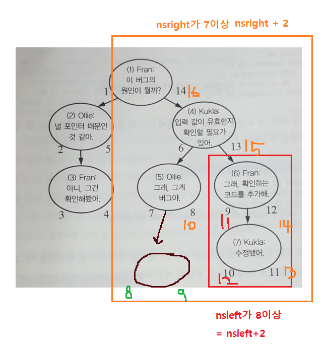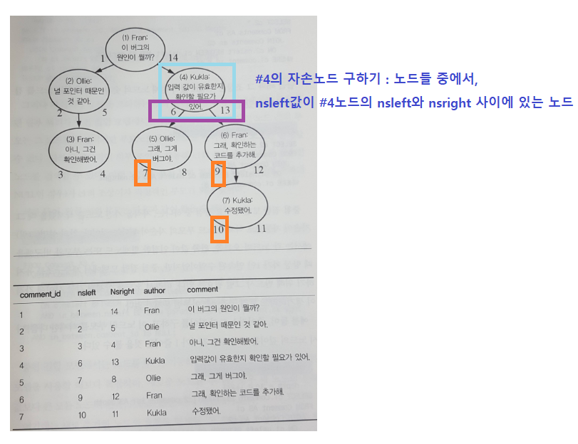 현재 노드의 nsleft와 nsright가 각각 범위가 된다. 테이블을 풀스캔하면서, nsleft가 6과 13사이인 노드는 모두 #4노드의 자손노드이다.