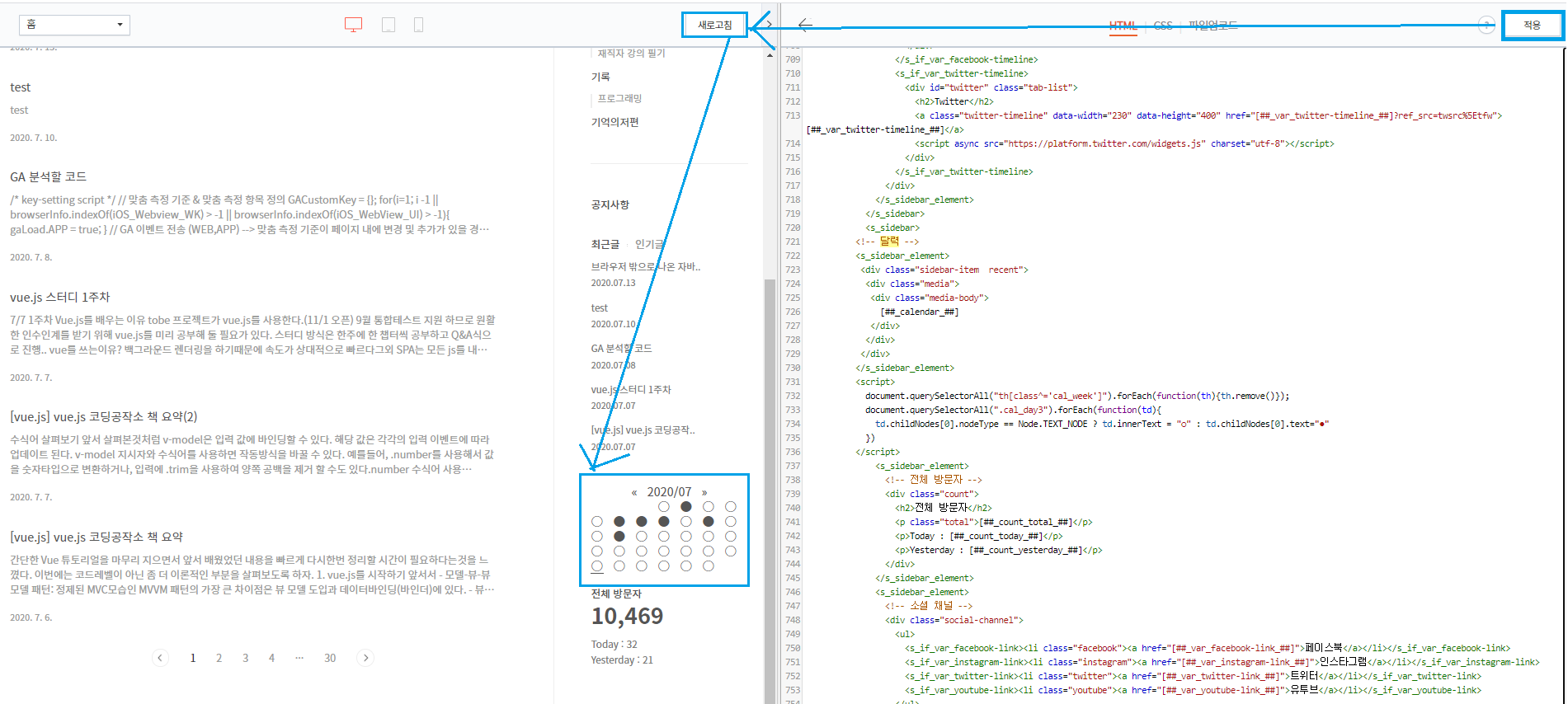 4) [적용] > [새로고침] 버튼을 클릭하여 미리보기에 달력이 정상적으로 표현되는지 여부를 확인한다.